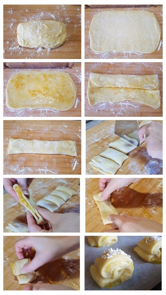 Wanneer het deeg is verdubbeld, het briochedeeg op een met bloem bestoven werkbank gieten en met de handen ontluchten. Met behulp van een deegroller een vel van 3-4 mm dik uitrollen tot een rechthoek. Smeer dan sinaasappelmarmelade over het hele vel. Er is niet veel nodig omdat het tijdens het snijden kan uitlopen. Vouw het briochevel zoals op de foto, eerst de ene kant en dan de andere. Snijd met een mes stroken van 4 cm breed en trek ze voorzichtig iets uit en rol ze op. Uit de foto’s begrijp je dat er spiralen ontstaan. Leg alle spiralen op een met bakpapier beklede bakplaat, met een beetje afstand ertussen. Laat nog 45 minuten rijzen. Bestrijk daarna de bovenkant met het losgeklopte eigeel en melk en strooi ten slotte de suikergranulaat erover. Bak vervolgens in een voorverwarmde statische oven op 180ºC gedurende ongeveer 20 minuten of tot ze goudbruin zijn.
