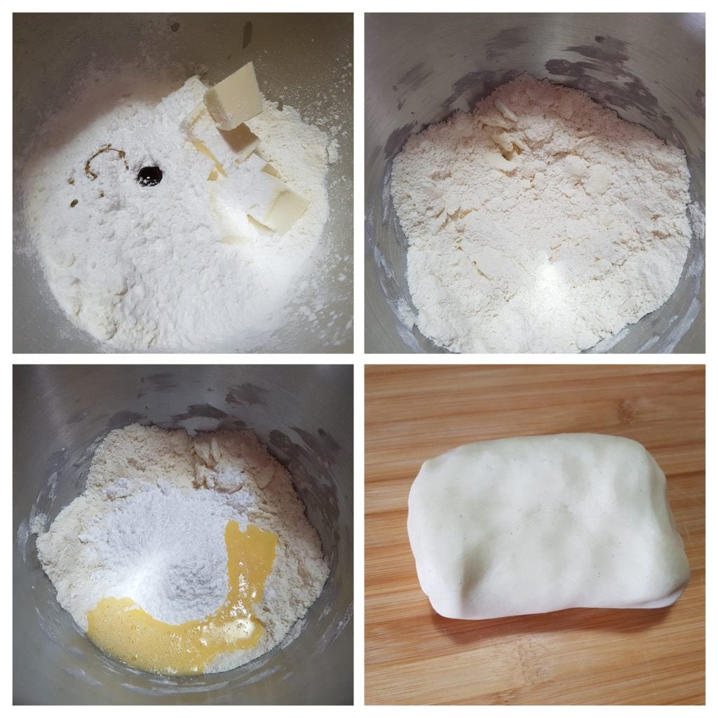 Om deze schattige spookkoekjes te maken, moet je het deeg voorbereiden. Je kunt het zandtaartdeeg met de hand maken in een kom, maar ik heb voor het gemak de keukenmachine gebruikt. Doe beide gezeefde bloemsoorten, de koude boter in stukjes, de vanille-essence, en het zout in de kom van de keukenmachine en meng alles met de K-haak op snelheid 1-2. Als het ‘zandachtig’ mengsel klaar is, zo genoemd omdat het mengsel op zand lijkt, voeg dan de poedersuiker en het ei toe en meng verder tot een glad en homogeen deeg ontstaat. Verpak het deeg in vershoudfolie en laat het een uur in de koelkast rusten.