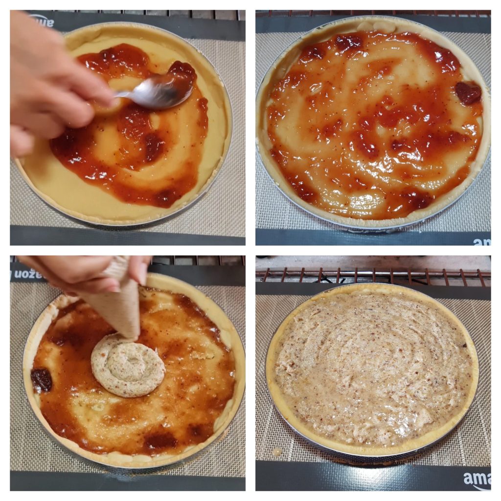 Haal de taart uit de koelkast, verspreid een laagje aardbeien- of frambozenjam over de bodem en bak in een voorverwarmde statische oven op 170ºC gedurende 20 minuten. Haal de vorm uit de oven, leg de laag hazelnoot frangipane crème erop en strijk deze goed glad. Zet opnieuw in de oven op 160ºC voor 25 minuten. Haal de taart uit de oven en laat deze volledig afkoelen.