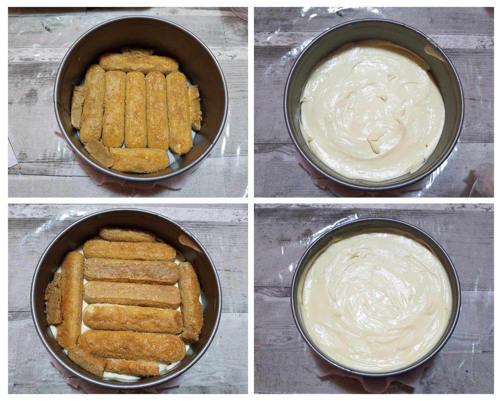 Giet de van tevoren gezette en afgekoelde koffie in een kom en voeg suiker toe. Bekleed de bodem van een springvorm van 20 cm met bakpapier. Doop de lange vingers snel in de koffie en leg ze op de bodem van de springvorm. Haal de crème uit de koelkast en verdeel de helft van het mengsel over de lange vingers. Leg een tweede laag gedoopte lange vingers erop en eindig met de rest van de crème. Zet in de vriezer voor 5-6 uur.