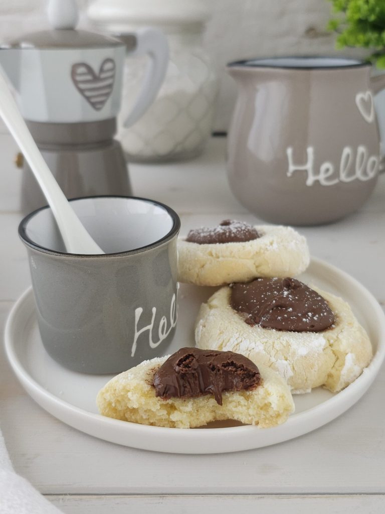 Breek met je handen kleine hoeveelheden deeg af, ongeveer 25 g per stuk, en vorm balletjes. Rol ze in een diep bord met poedersuiker, zodat ze volledig bedekt zijn. Leg de balletjes op een bakplaat bekleed met bakpapier en gebruik een kleine zeef om elk balletje plat te drukken en een holte te maken. Plaats een theelepel Nutella in het midden. Bak 10-12 minuten in een voorverwarmde oven op 180°C tot ze licht goudbruin zijn. Zet de oven uit, haal de koekjes eruit en laat ze volledig afkoelen zonder ze aan te raken.