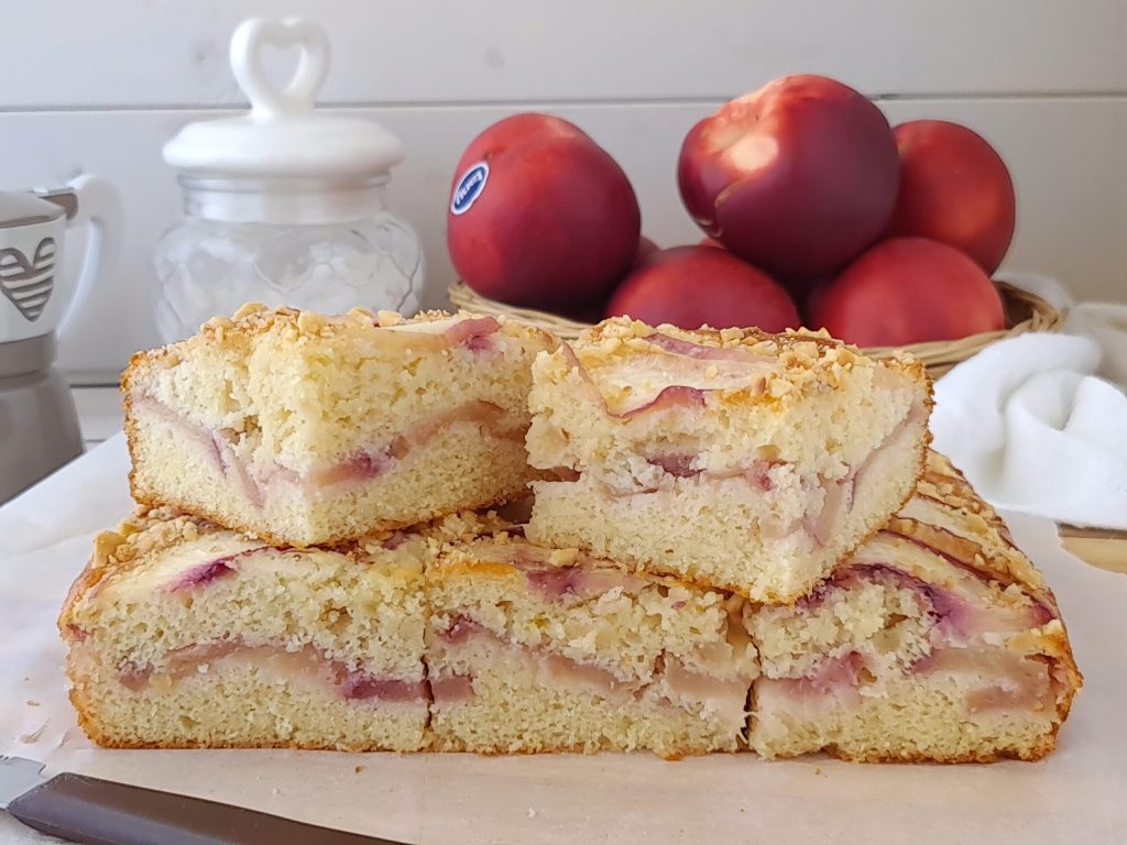 De zachte perziktaart kan een paar dagen bewaard worden, het liefst in de koelkast. Dankzij de aanwezigheid van yoghurt en eiwitten is het deeg superzacht. Als je wilt, kun je de nectarines vervangen door ander fruit naar keuze.