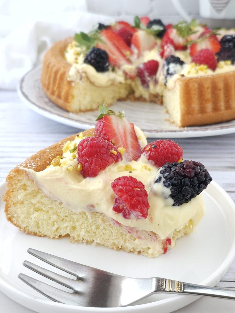 De zachte taart met bosvruchten en diplomatieke room kan een paar dagen in de koelkast worden bewaard. Je kunt het fruit naar wens glanzend maken met taartgelei.