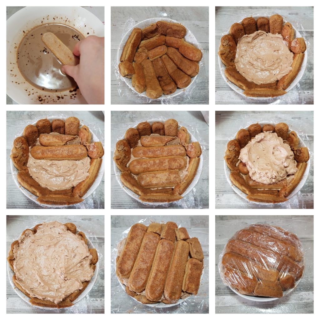 Bekleed een halve bolvormige zuccottovorm met vershoudfolie, leg de in melk en cacao gedrenkte lange vingers erin, zorg ervoor dat je zowel de bodem als de randen van de vorm helemaal bedekt. Schenk de helft van de rochercrème erin en strijk glad, leg er nog een laagje in melk en cacao gedrenkte lange vingers op, eindig met de resterende crème en leg er nog een laagje in melk en cacao gedrenkte lange vingers op. Sluit de vorm goed af en zet hem 2 uur in de vriezer.