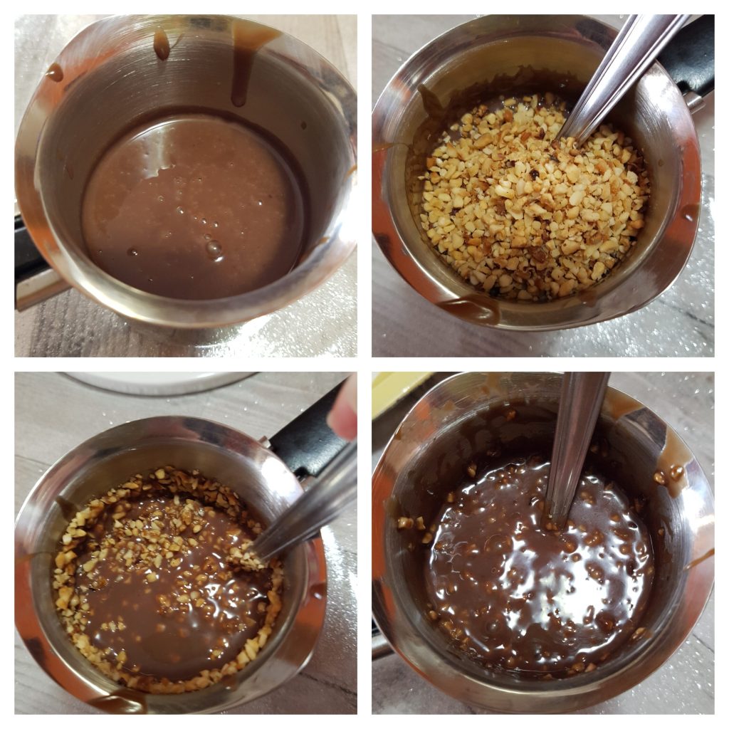 Verwarm in een klein pannetje de room, zet het vuur uit en voeg de gehakte melkchocolade toe en meng tot je een glanzende en romige glazuur hebt. Voeg tenslotte de hazelnootkrokant toe en meng. Laat ongeveer tien minuten afkoelen of totdat het glazuur een temperatuur van 35° bereikt.