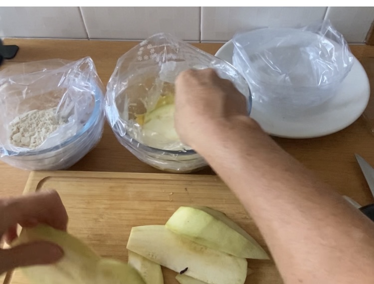 • Klop de eieren in een kom en dompel de aubergineplakken in het losgeklopte ei, zorg ervoor dat elke plak goed bedekt is.