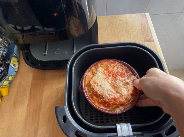 • Hoe lang duurt het voor de Aubergine Parmigiana in eenpersoons terrines om te koken in de heteluchtfriteuse?
