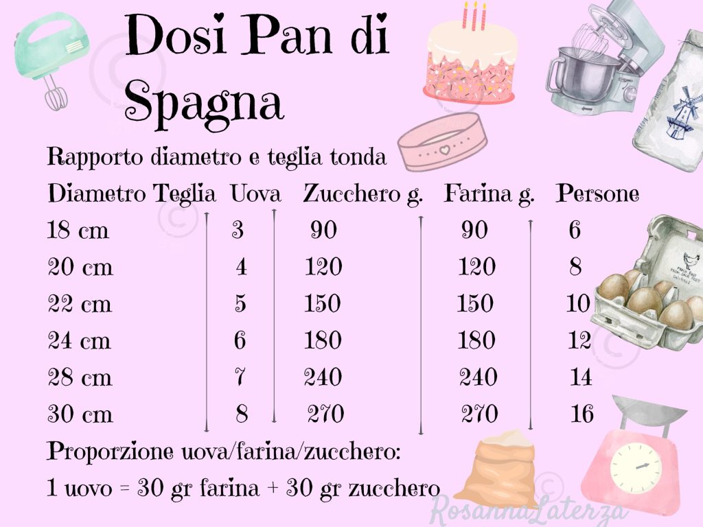 Deze tabel helpt je om de berekeningen te maken zonder enig probleem of angst voor fouten. Wat betreft de verhoudingen tussen eieren, bloem en suiker, moet de volgende berekening worden uitgevoerd: voor elk ei van middelgrote grootte, moeten 30 gram bloem en 30 gram suiker worden gebruikt.