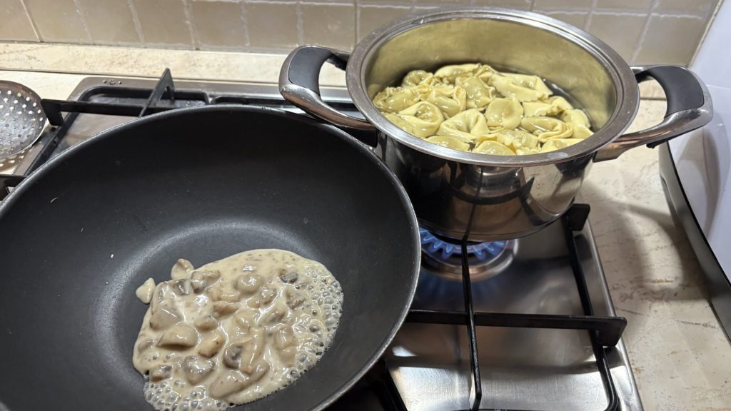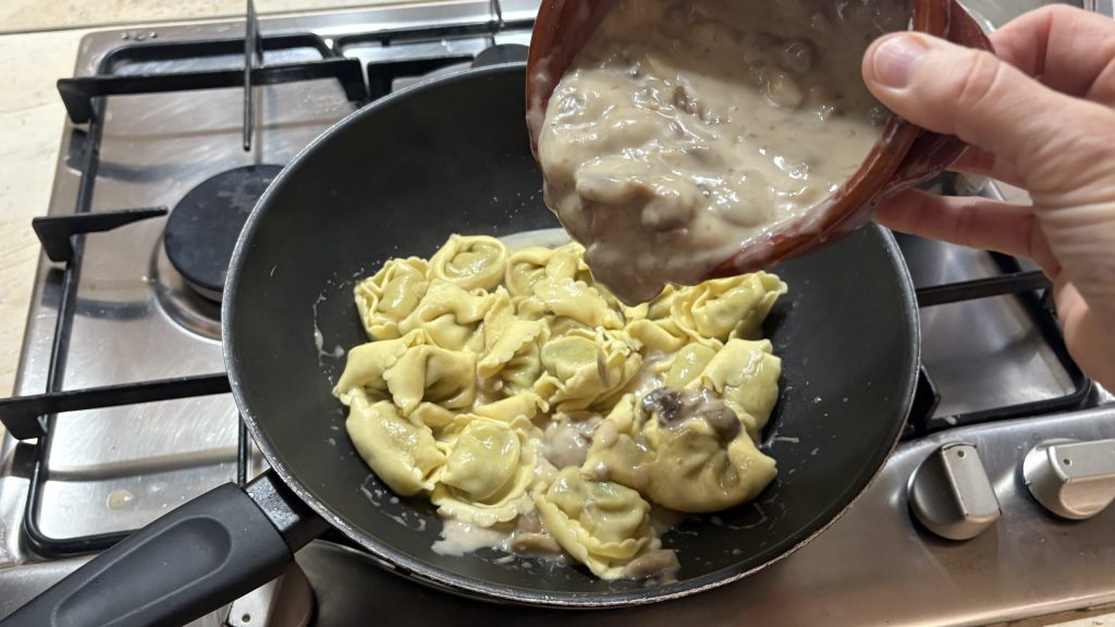 • In een grote pan, bak voorzichtig de pasta met de champignon paddenstoelensaus. Laat smaken en breng op smaak met peper of gehakte peterselie.