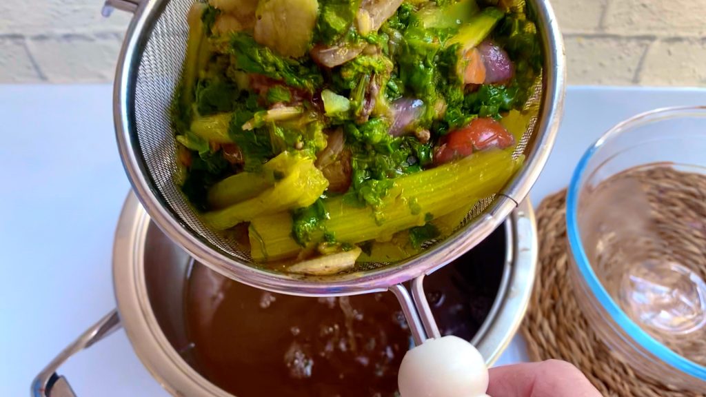 Na een uur, zeef de bouillon door een fijne zeef of kaasdoek om de vaste stoffen van de vloeistof te scheiden. De verkregen groentebouillon kan onmiddellijk worden gebruikt voor soepen, risotto’s of als basis voor andere recepten, of in de koelkast worden bewaard voor een paar dagen of worden ingevroren voor toekomstig gebruik.