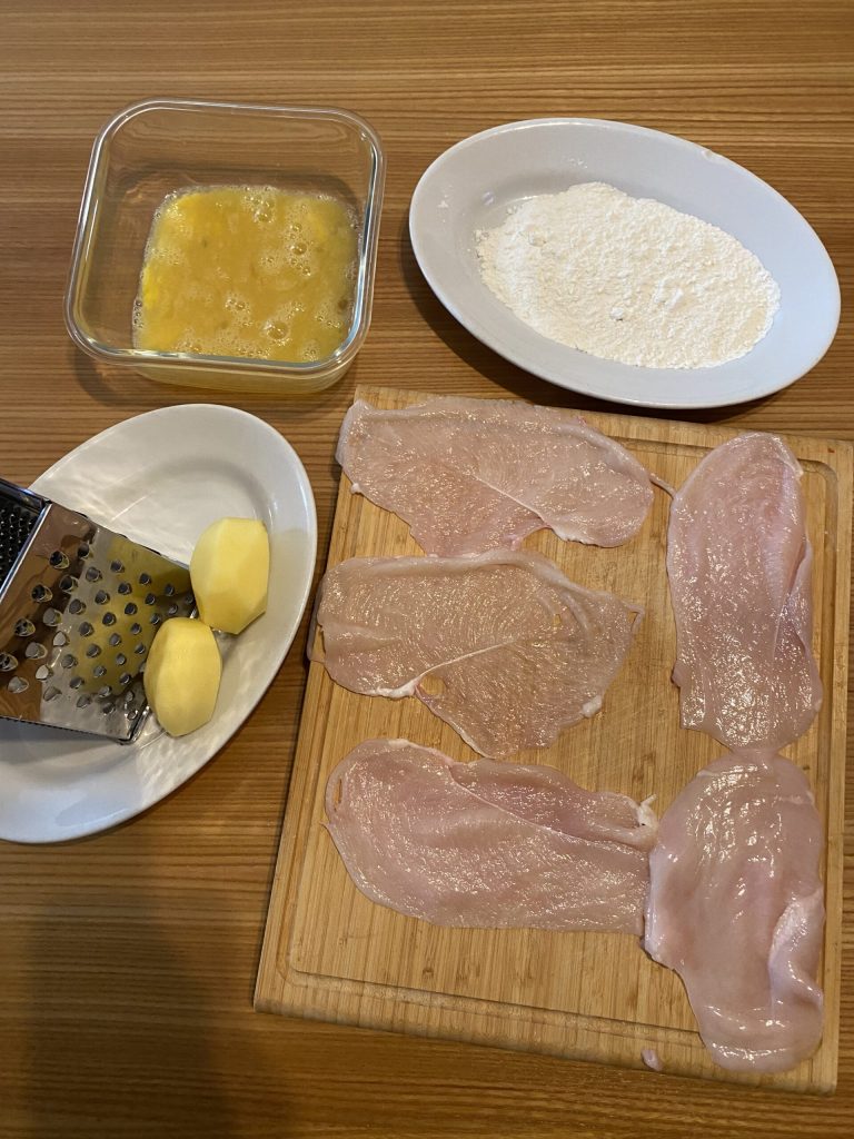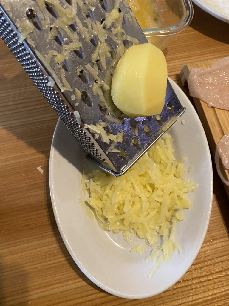 Om de bereiding te voltooien, haal je de plakjes kip goed door de geraspte aardappelen en zorg je ervoor dat de aardappelschijfjes goed aan elke plak blijven plakken.