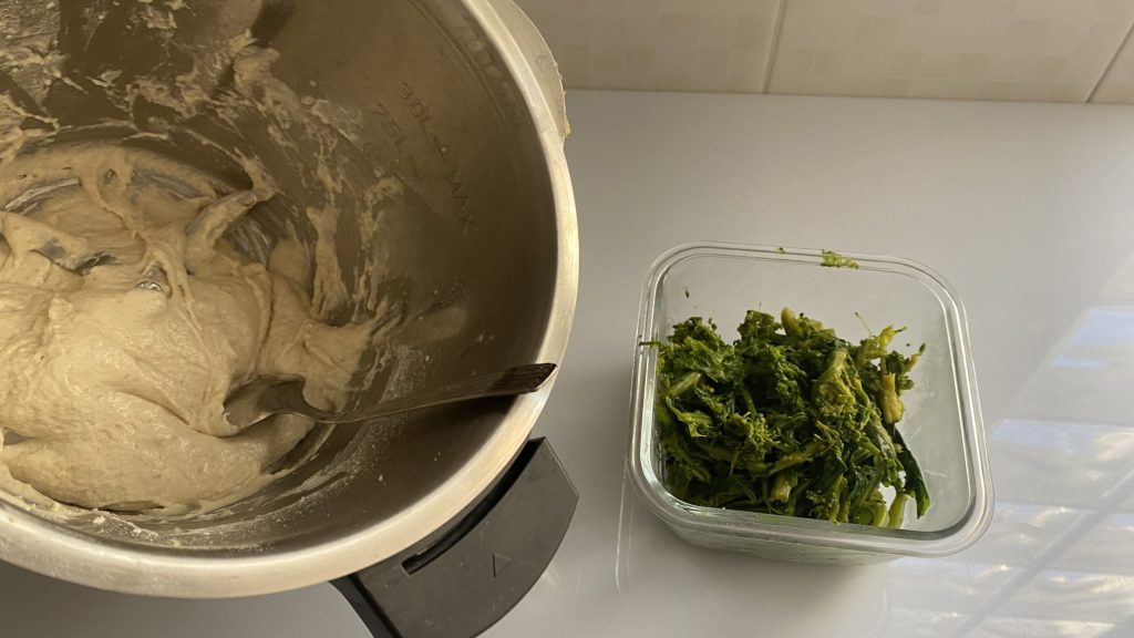Blancheer ondertussen de raapstelen in ruim gezouten water en laat ze goed uitlekken. Voeg ze, eenmaal afgekoeld, toe aan het gerezen deeg in de Bimby.