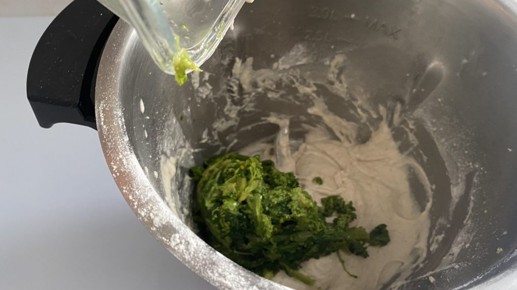 Voeg de geblancheerde raapstelen toe en mix alles op snelheid 5 gedurende ongeveer 30 seconden, totdat een homogeen deeg is verkregen.