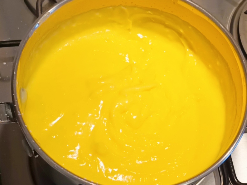 Wanneer de melk met de room bijna kookt, giet het beetje bij beetje bij de eidooiers. Als je de citroenschil hebt toegevoegd, vergeet die dan niet te verwijderen voordat je de melk giet. Zet het vuur op de laagste stand en begin te roeren.