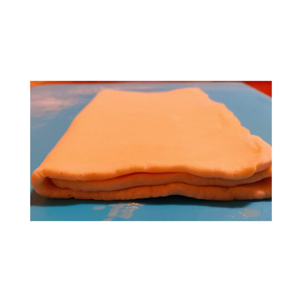 Haal het na het rusten uit de koelkast en begin met de 4 vouwen. Rol het een beetje uit, vouw dan een kant net voorbij het midden en breng vervolgens de kleinste kant ernaast. Het open gedeelte moet voor je liggen.