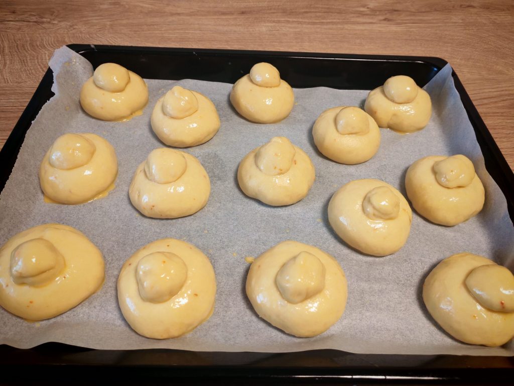 • Leg bakpapier op de bakplaat en plaats de briochejes op afstand van elkaar. Laat ze 4 uur rijzen.