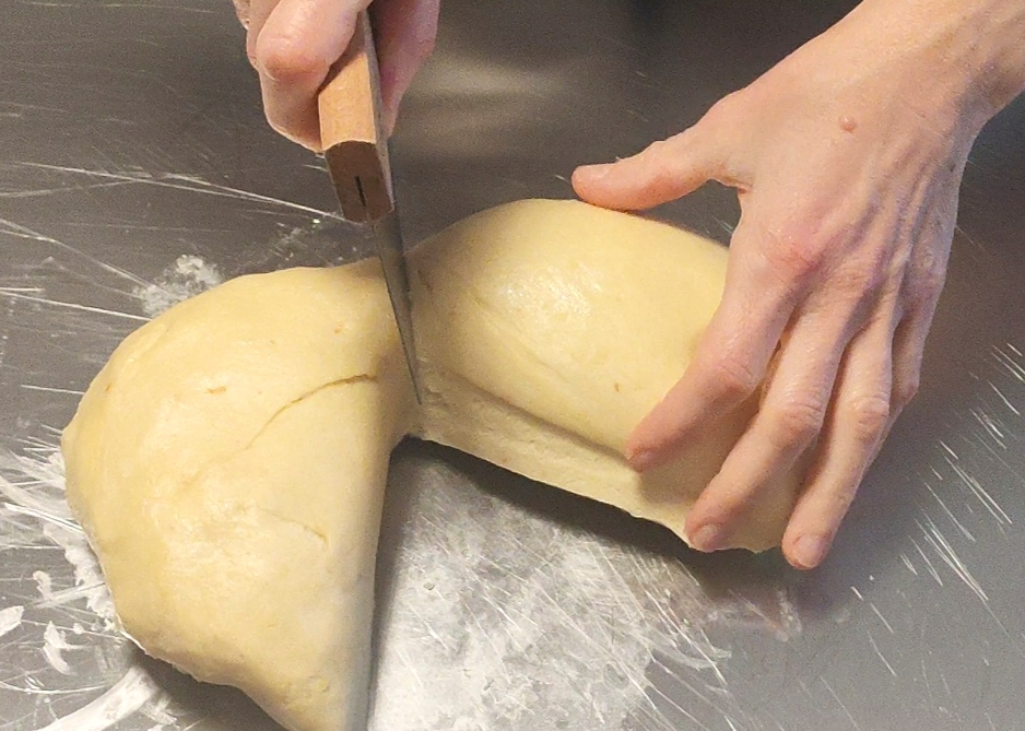• Na de tijd haal je het deeg uit de koelkast en werk je het nog koud, waarbij je bolletjes maakt om het in vorm te brengen.