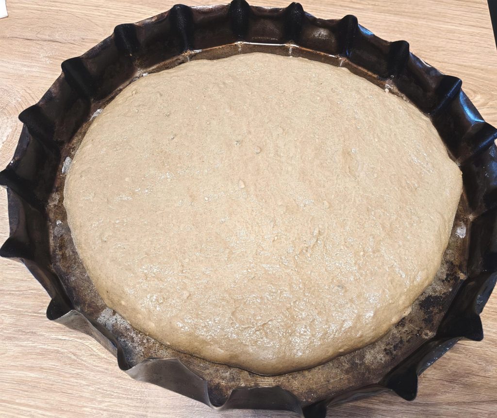 • Haal dan het deeg eruit, kneed het een paar minuten op een werkblad met een beetje meel. Vet de bakvorm in en leg het deeg erin. Laat het ongeveer 2 uur rijzen.
