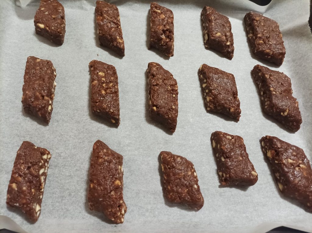 Snijd stukken van ongeveer 3 cm breed. Bekleed de bakplaat met bakpapier en bak 15 minuten in een voorverwarmde statische oven op 170°.