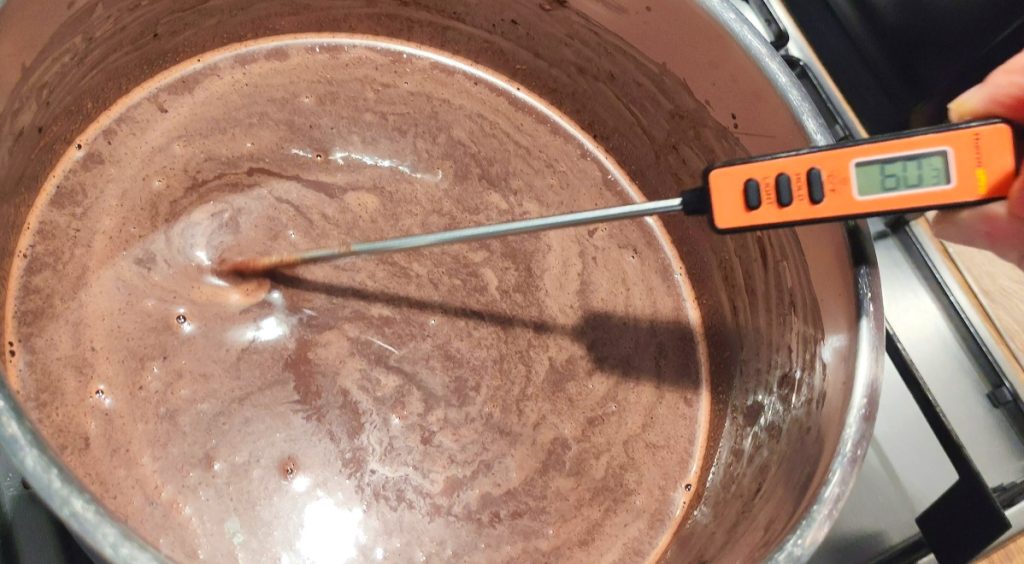 • Breng met een thermometer het geheel naar een temperatuur van 60°C. (Raak met de thermometer de bodem van de pan niet aan, anders kunnen de graden niet kloppen).