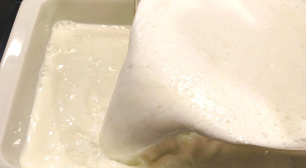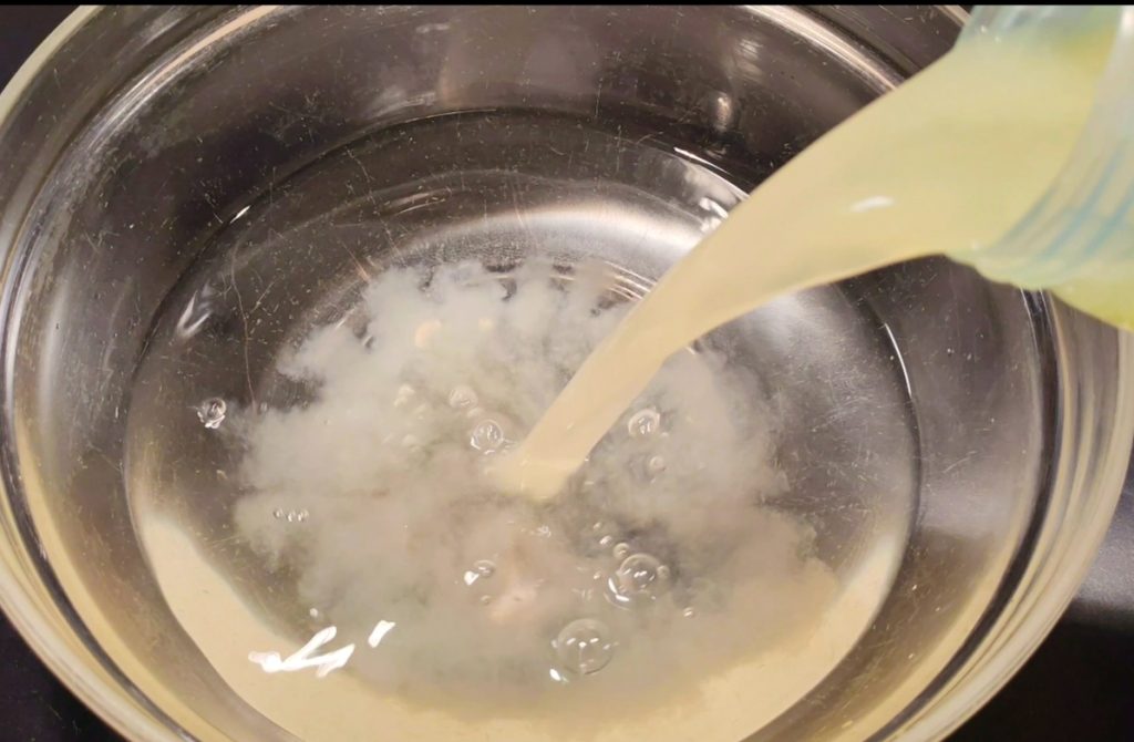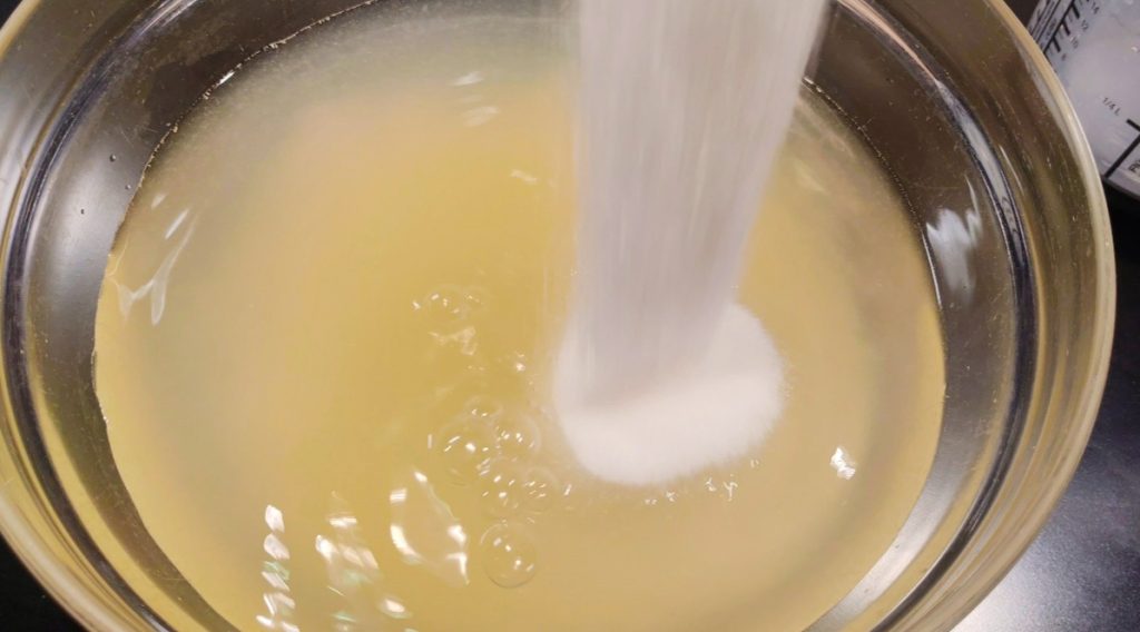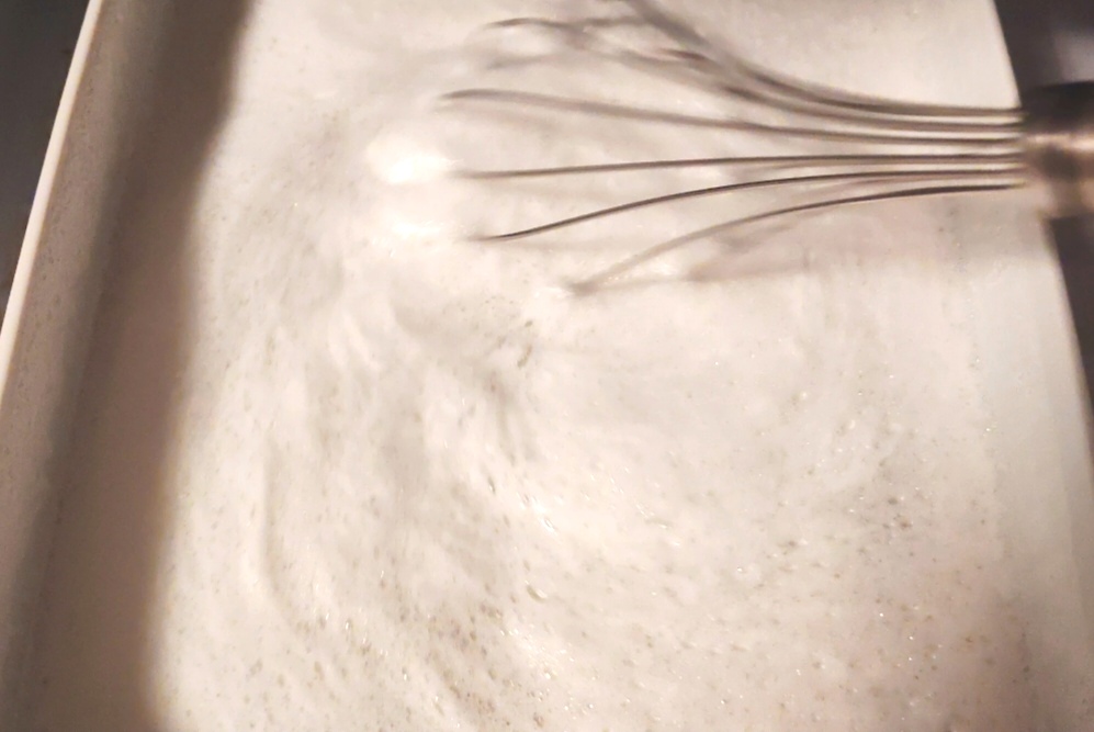 Als de suiker goed is opgelost, begin je beetje bij beetje de eiwitten toe te voegen terwijl je met de garde roert tot alles is opgenomen.