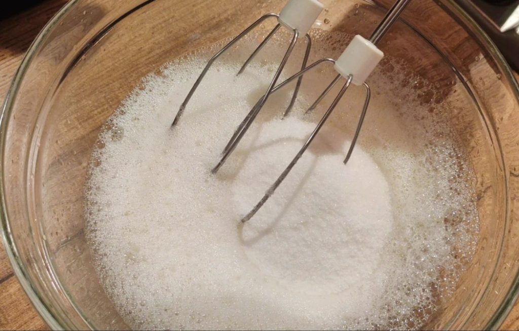 Eerst de eiwitten in een kom doen en beginnen op te kloppen;