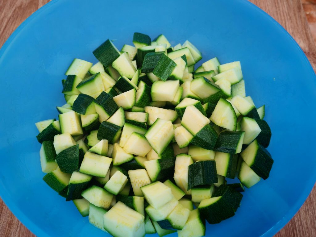 Was en snijd de uiteinden van de courgettes, snijd ze dan in blokjes.