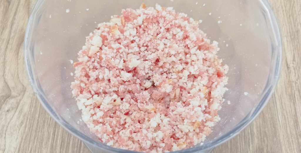 Neem het spek en de gerookte scamorza, hak ze een beetje fijn en plaats ze in de hakmolen.