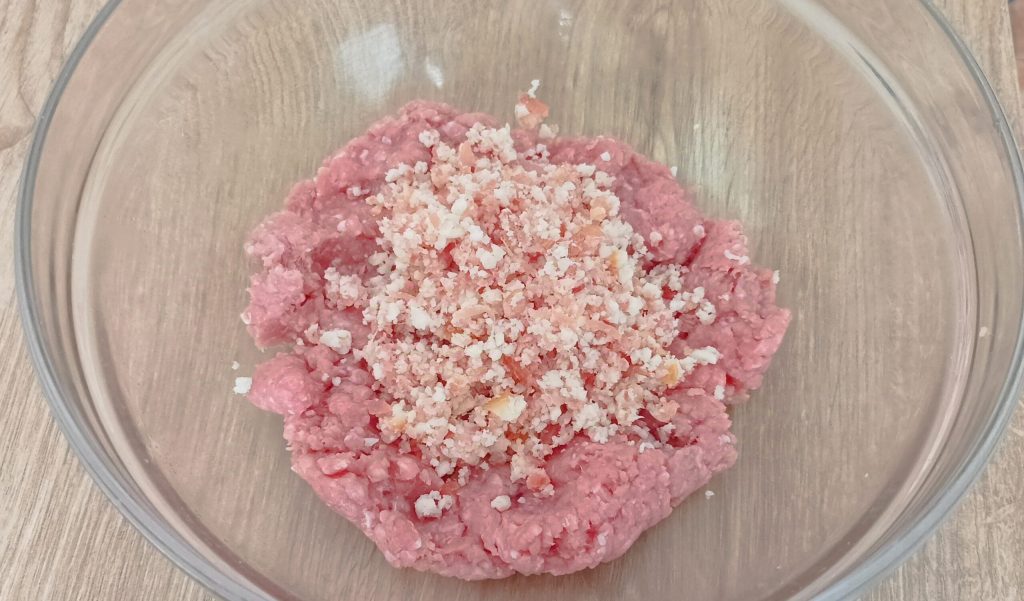 Breng eerst het gehakt op smaak met zout en peper, verdeel het mengsel vervolgens in twee gelijke delen als je net als ik twee verschillende smaken wilt maken.