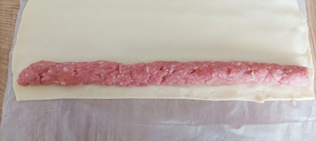 Verdeel het vlees in stukken van 120 g en vorm een “staaf”, leg deze op de rand van het deeg en rol het op zodat de randen samenvallen. Snijd langs de “staaf”.