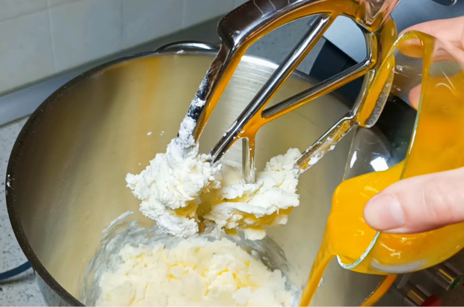Voeg vervolgens de eidooiers toe met daarin opgelost een snufje zout. Mix en laat opnemen.