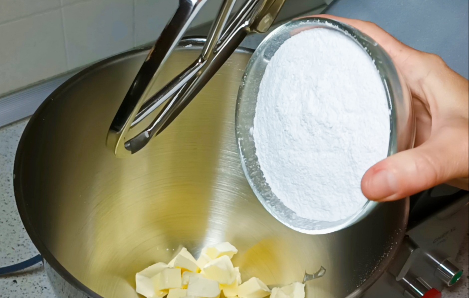 Doe koude boter in stukjes en de poedersuiker in een keukenmachine. Mix voor een paar seconden en voeg dan de aroma’s toe.