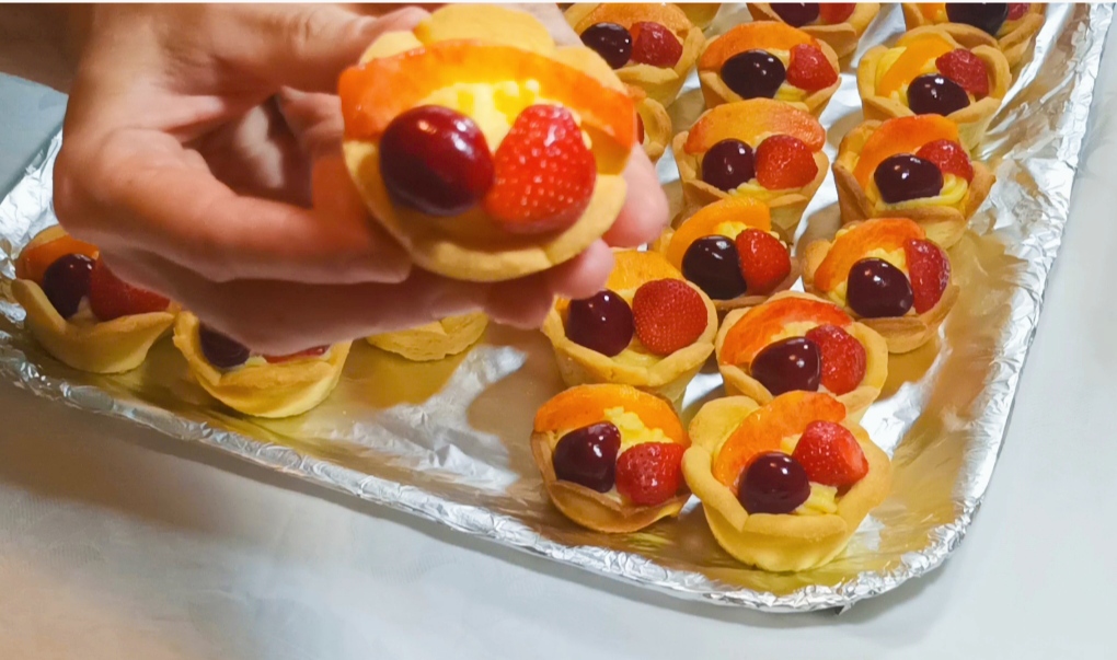 De fruitmandjes zijn klaar! Bestrooi ze voor het serveren met poedersuiker.