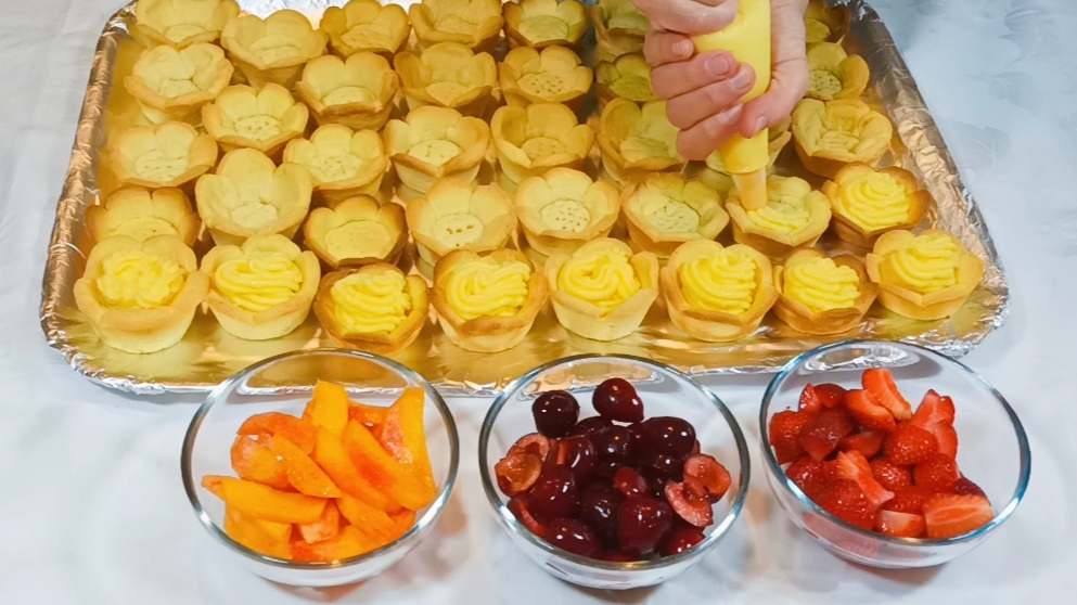 De fruitmandjes zijn heerlijke zandkoekjes, precies zoals die we in de banketbakkerij tegenkomen. Ze kunnen op verschillende manieren worden gevuld, met banketbakkersroom, met lemon curd, met jam, met chocolade ganache, met room, enz. Ze kunnen worden gedecoreerd met vers fruit, chocoladebolletjes, notenschilfers, en meer. Kortom, je kunt je fantasie de vrije loop laten en verschillende smaken tevreden stellen. De fruitmandjes zijn een alternatief voor fruit-, jam- en chocoladetaarten en ze zijn ook erg mooi om te serveren, vooral wanneer er meer mensen zijn. Het bereiden is heel eenvoudig, het zanddeeg is in 5 minuten klaar, dan laat je het 30 minuten rusten in de koelkast, je snijdt de vormpjes uit en bakt ze in 15 minuten. Met deze mandjes maak je echt indruk!!! Dus probeer het zelf eens!!