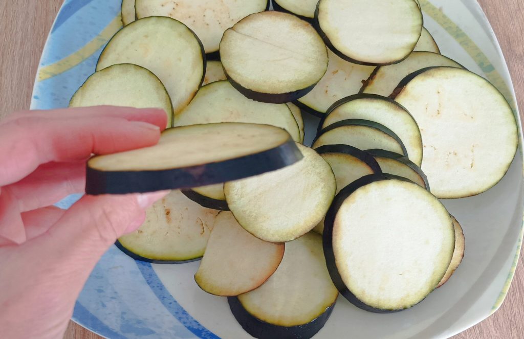 De voorbereiding is zeer eenvoudig. Was de aubergines en snijd ze horizontaal in plakjes van 5 mm dikte.