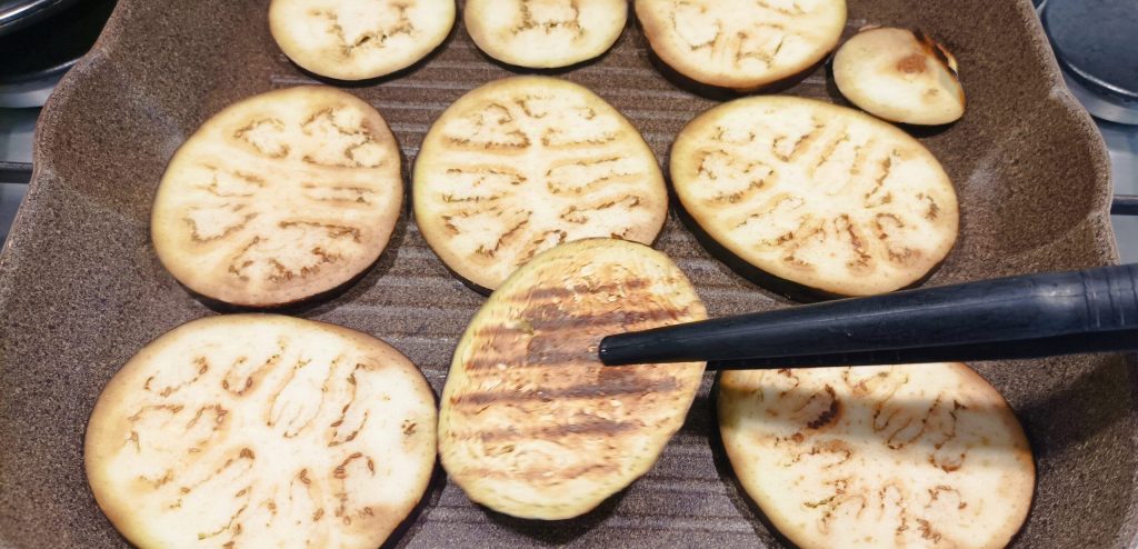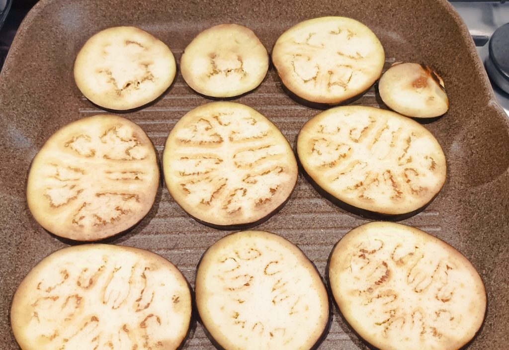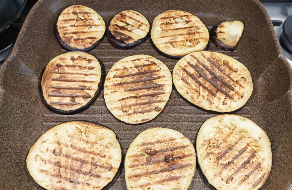 Neem de grill en verwarm deze goed voor, hij moet behoorlijk heet zijn. Leg de aubergineplakken erop en begin ze te grillen op een matig vuur gedurende ongeveer 3 minuten, draai ze vervolgens om en laat ze nog 3 minuten koken.