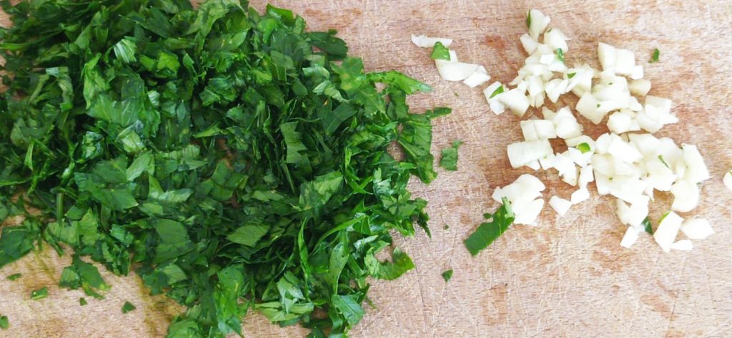 Neem ten slotte een beetje peterselie en het teentje knoflook en hak ze fijn. Leg de aubergines op een serveerschaal en breng op smaak met de peterselie, knoflook, olie, azijn en zout. Dek af met plasticfolie en laat 30 minuten op kamertemperatuur intrekken.