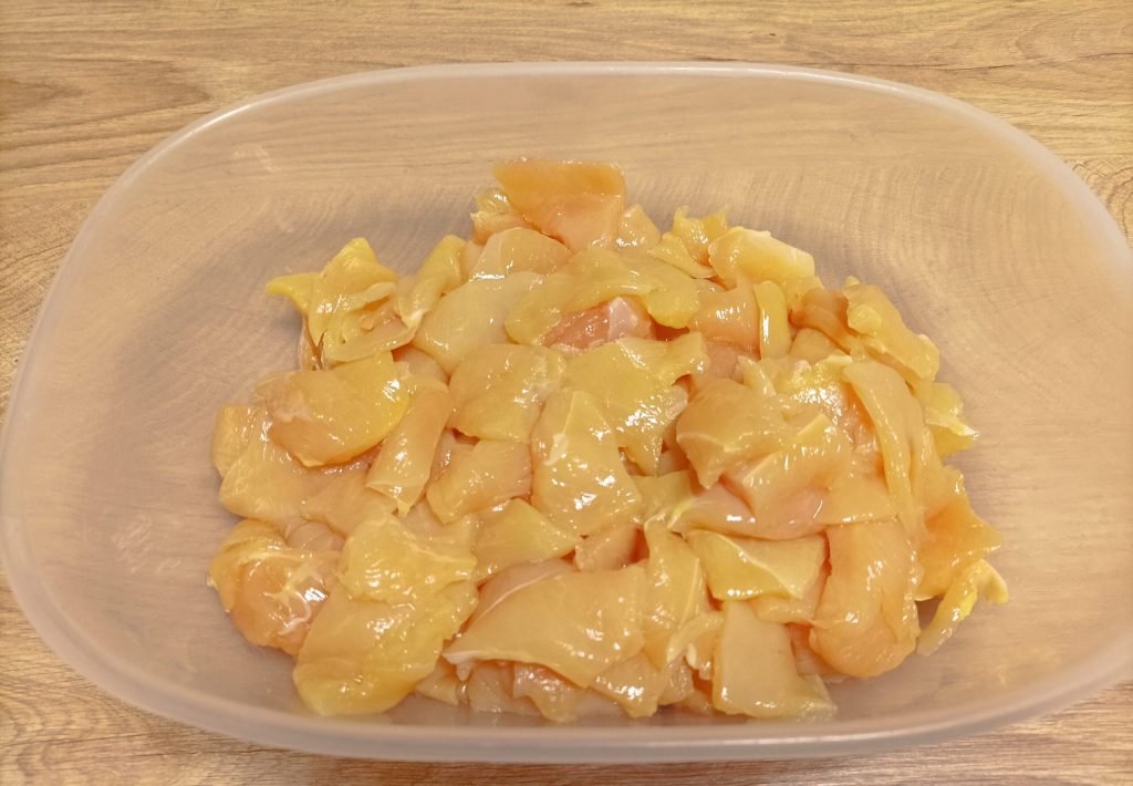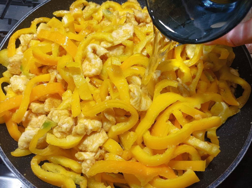 Begin met het in stukjes snijden van de kipfilet, niet te groot. Bestuif ze vervolgens goed zodat ze droog en bedekt zijn met bloem. Bereid de paprika’s voor, was ze, verwijder de zaden en de steel, snijd ze eerst in tweeën en vervolgens in dunne plakjes van ongeveer een halve centimeter.