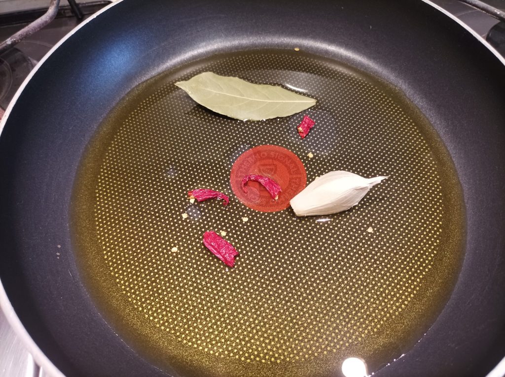 Doe in een pan genoeg olie om de bodem te bedekken, knoflook, laurier en chilipeper, zet aan en laat sudderen.