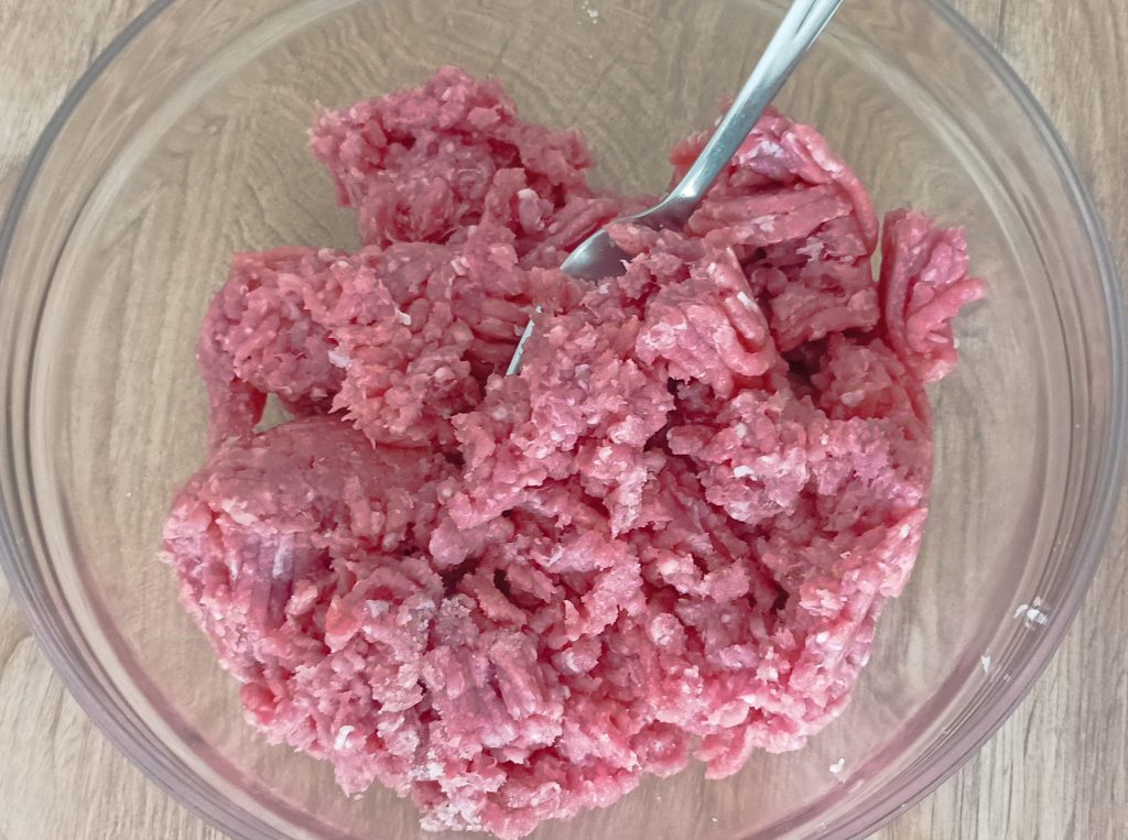 Bereid nu het vlees en voeg alleen zout toe, vorm een bal en tussen twee vellen bakpapier maak je een schijf met behulp van de deegroller zodat de dikte overal gelijk is.
