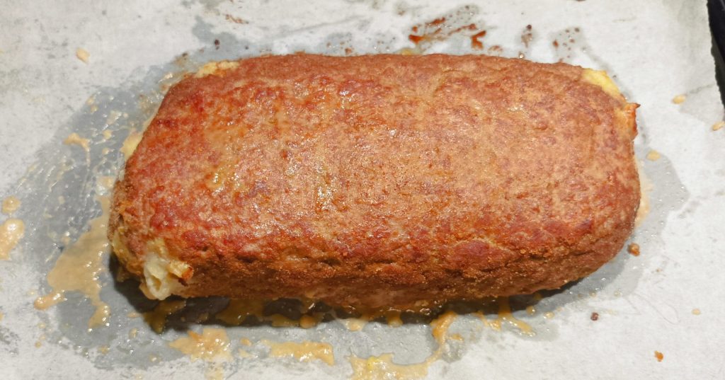 Rol op en sluit de randen zoveel mogelijk door het vlees aan te drukken. Zodra je klaar bent met het sluiten van het gehaktbrood, bereid je wat paneermeel gemengd met kurkuma en rol je het gehaktbrood erin zodat alle kanten bedekt zijn.