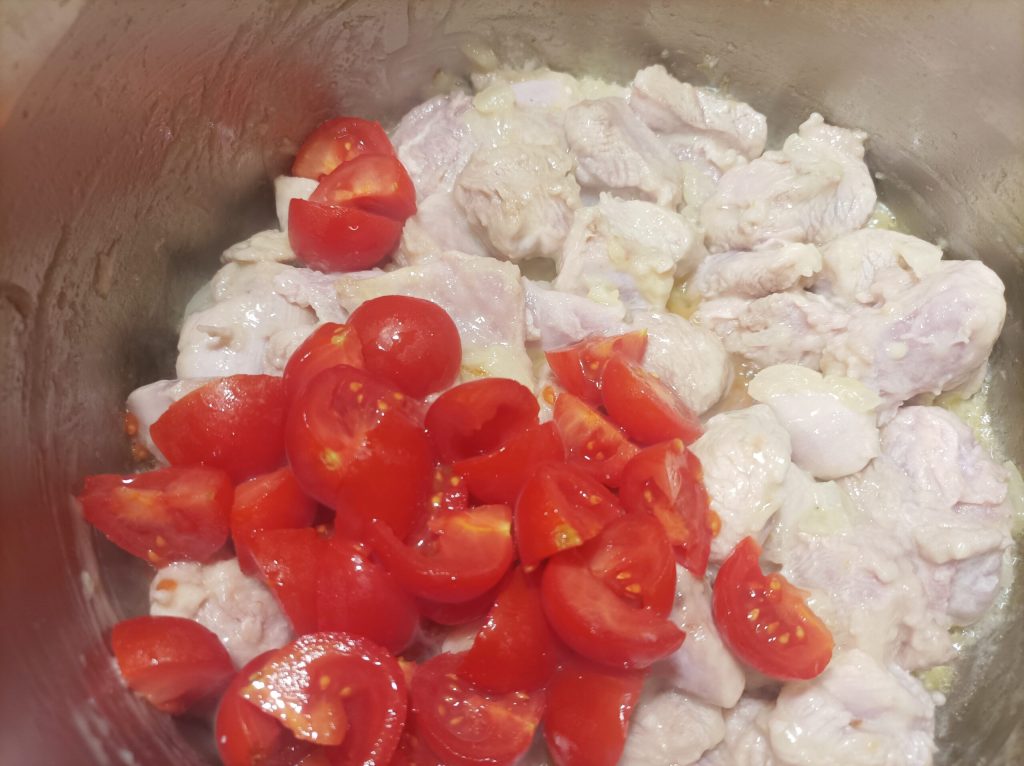 Laat verdampen, verlaag dan de vlam en voeg de gehalveerde of in vieren gesneden cherrytomaten, de aardappelen, het bouillonblokje en de peper toe.