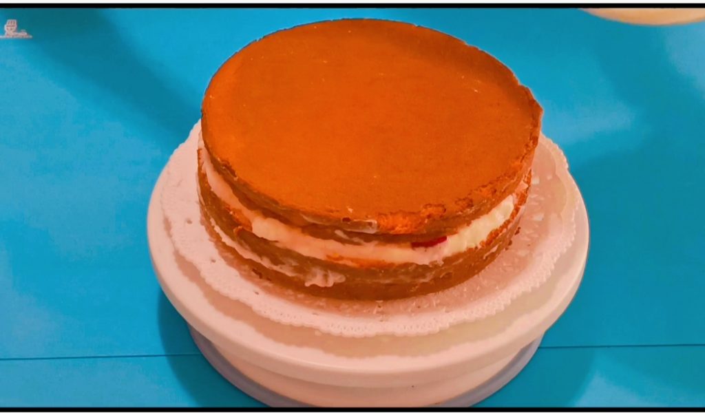 Op dit punt kun je ervoor kiezen om het te bedekken zoals je het lekkerst vindt, botercrème, chocoladesaus of room. Ik heb de crème die ik over had van de vulling gebruikt en 2 eetlepels gecondenseerde melk toegevoegd. Breng de crème aan op het schijf en verspreid het zachtjes over het hele oppervlak en de zijkanten, uiteraard niet zo dik als andere coatings, kan het een beetje langs de zijkanten vallen, maar het zal dan snel stollen.
