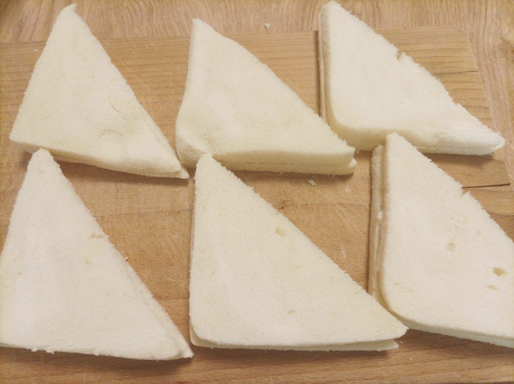 Neem de sneetjes brood en snijd ze doormidden diagonaal of verticaal zodat er rechthoeken ontstaan. Ik heb sneetjes brood zonder korst gebruikt, als u korst hebt, moet u die verwijderen. Snijd de mozzarella in plakjes en dep ze met keukenpapier.