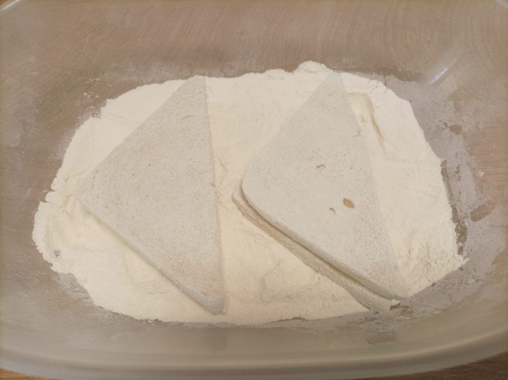 Wanneer alle sneetjes brood gevuld zijn, bereid dan in verschillende bakjes de bloem, het paneermeel en de losgeklopte eieren met een beetje zout.