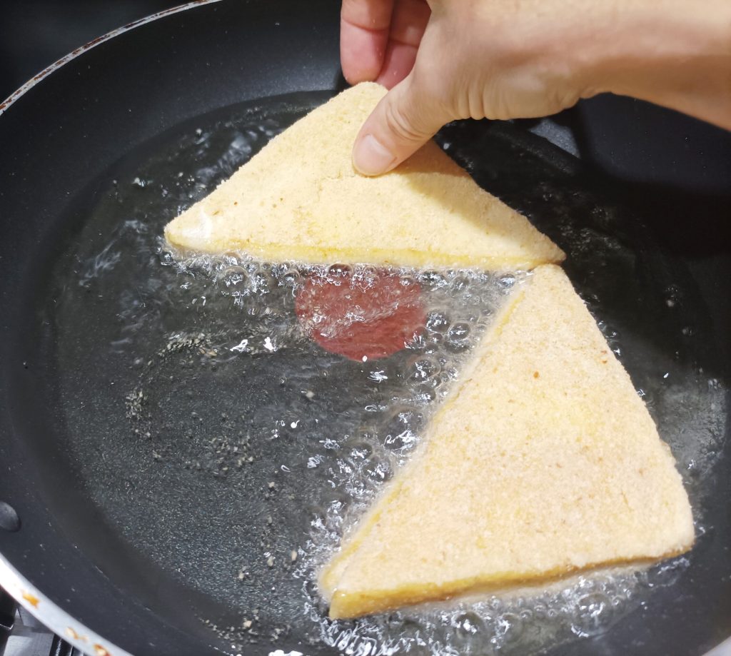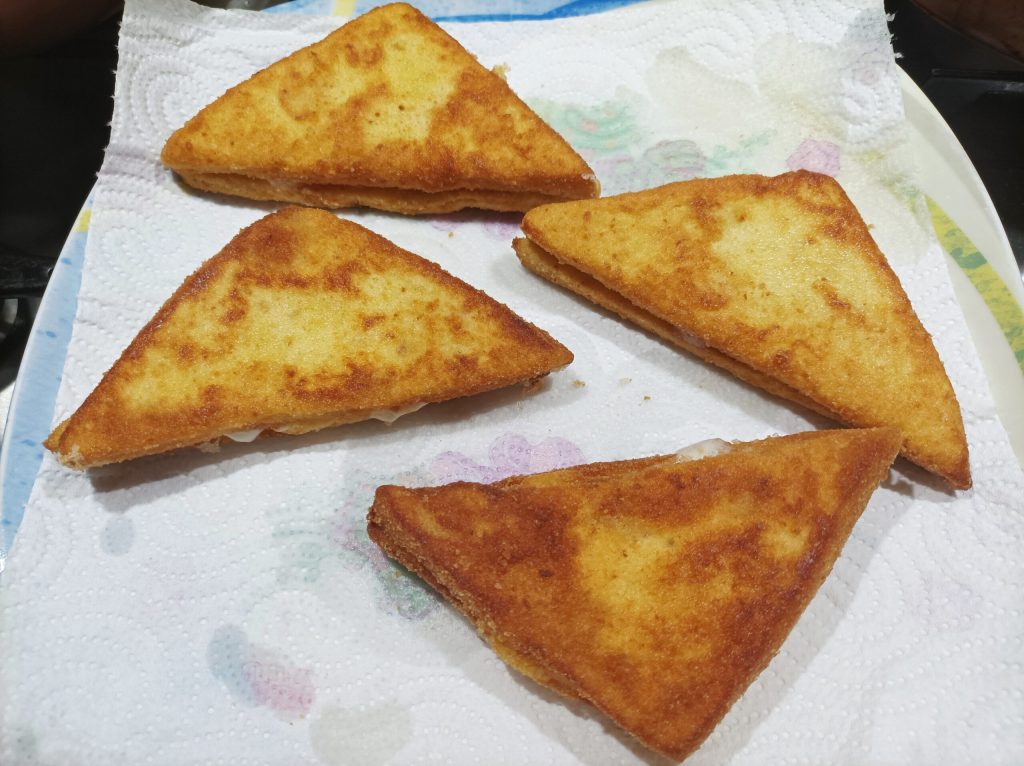 Doe olie in een pan en verhit het tot 170°C. Bak ze op matig vuur een paar minuten aan beide kanten, zodra ze goudbruin zijn, laat ze uitlekken en leg ze op een bord met keukenpapier.