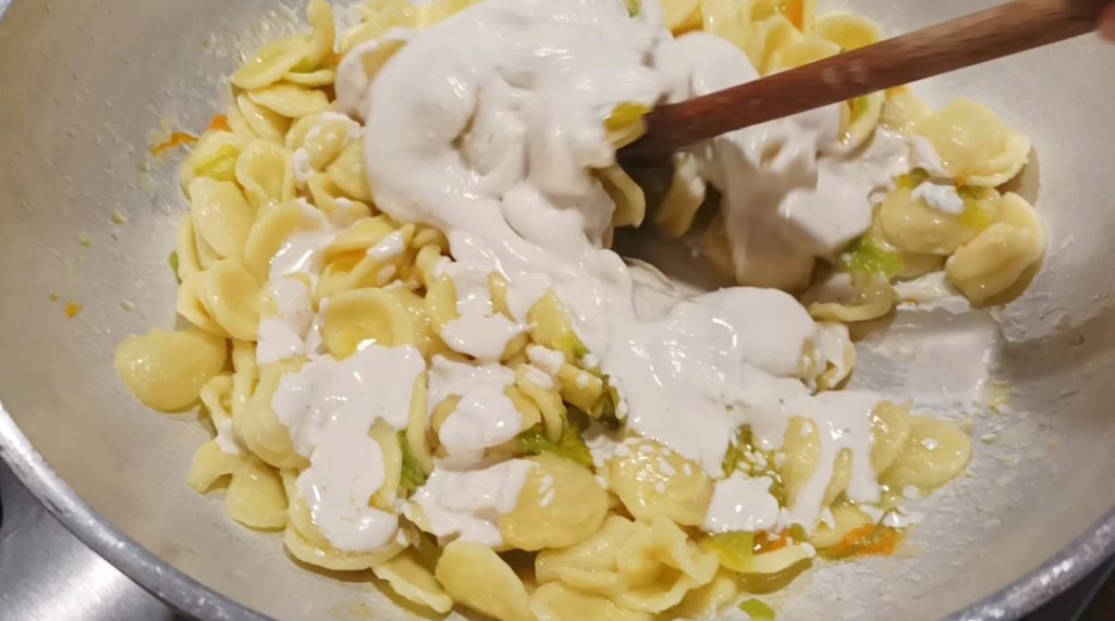 Op dit punt hebt u al de orecchiette gekookt, giet ze af en laat een beetje water over en doe ze in de hete olie.