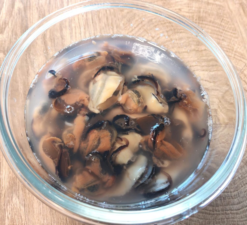 Verwijder allereerst de baard van de mosselen (als je ze niet al gepeld hebt gevonden), open ze dan met het mosselopener mes, of als dat niet lukt, kun je ze een paar minuten op het vuur openen. Bewaar ze met al hun water.