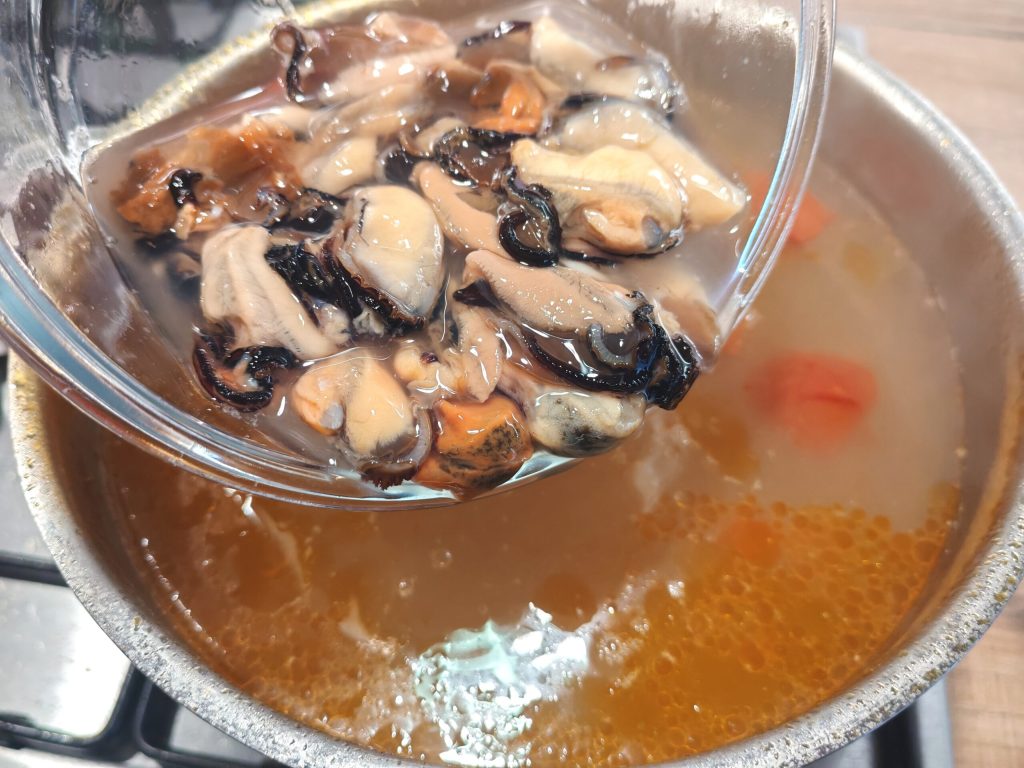 Na de tijd neem je de mosselen, filter je hun water en giet je het binnenin. Laat nogmaals 30 minuten koken.