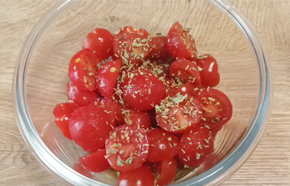 Halveer de cherrytomaatjes en breng op smaak met olie, zout en oregano.